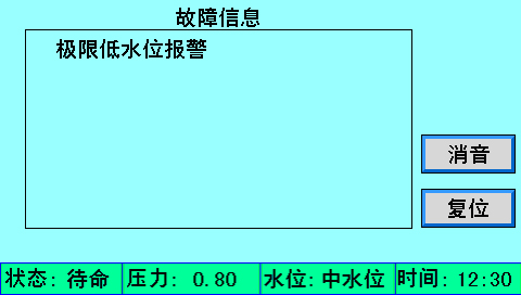 3、如發(fā)生缺水、超溫、超壓等報警時,應(yīng)及時排除故障狀態(tài)方可恢復(fù)運行;如柜內(nèi)帶有報警蜂鳴器(220V AC),則首先應(yīng)關(guān)閉報警音,蜂鳴器連續(xù)工作不可超過 30 秒。