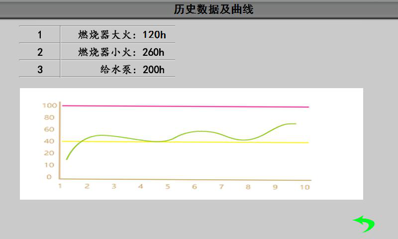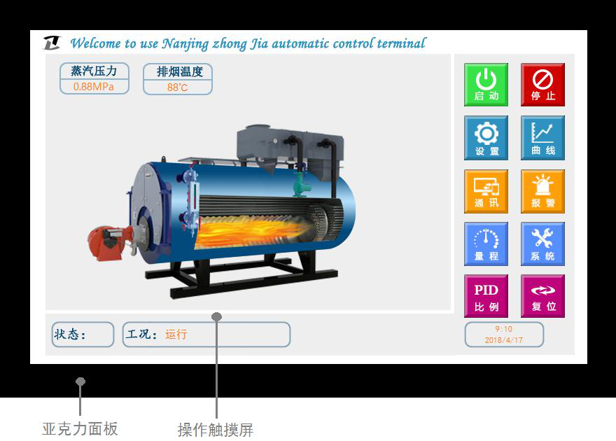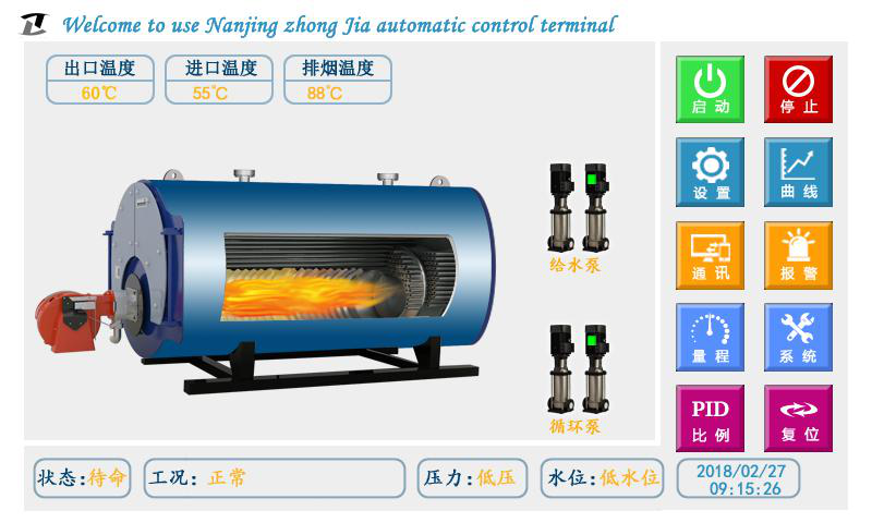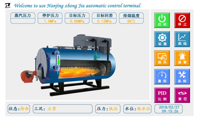 在鍋爐的上方顯示當(dāng)前鍋爐的出口溫度、進(jìn)口溫度或蒸汽的壓力狀況(壓力 變送器顯示壓力值)以及排煙溫度等。在鍋爐的左側(cè)是鍋筒水位的模擬水位計(jì),顯示鍋筒水位的狀態(tài)。 2.4 參數(shù)設(shè)置及數(shù)據(jù)查閱 該自控終端采用全觸摸功能操作,根據(jù)功能需要觸摸對應(yīng)的功能按鍵:
