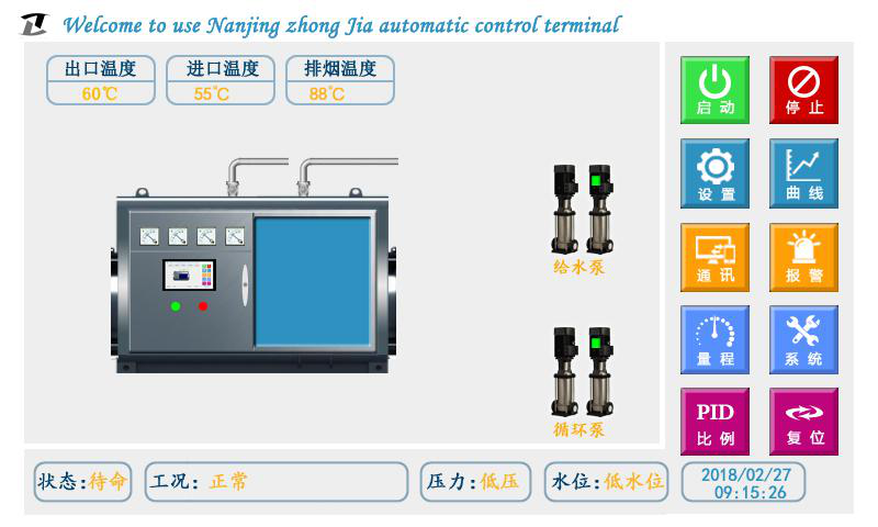 在屏幕正下方顯示控制器的工況。工況包括定時(shí)信息和燃燒器狀態(tài)。非報(bào)警狀態(tài)下,無定時(shí)顯示 “無定時(shí)”,有定時(shí)顯示“啟動時(shí)段”或“停止時(shí)段”;報(bào)警狀態(tài)下顯示具體的報(bào)警信息。屏幕上同時(shí)顯示燃燒器(加熱組)、補(bǔ)水泵(給水泵)、循環(huán)泵(冷凝泵)的工作狀態(tài),水泵的 主備狀態(tài)和手自動狀態(tài)。