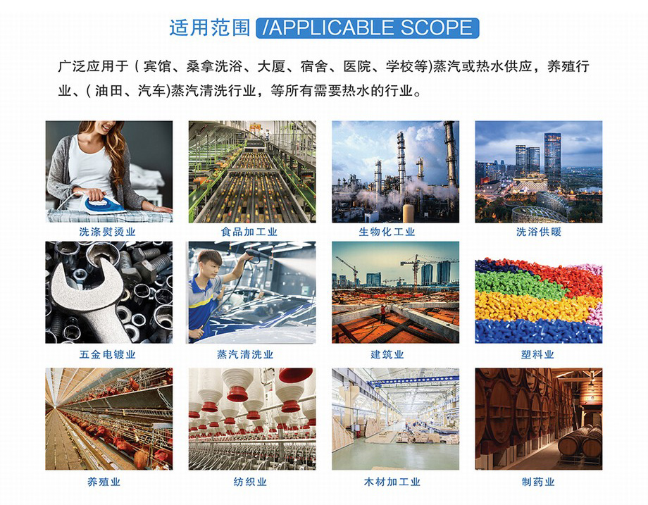 水泥房蒸養(yǎng)、釀酒、飲料瓶殺菌、醫(yī)療器械消毒、調(diào)味品蒸煮、食品烘干、糧食制品烘干、水泥構(gòu)件蒸養(yǎng)、輕工業(yè)加熱、地下倉(cāng)庫(kù)供暖、車(chē)間供暖、油罐清洗、除雪、蒸汽洗車(chē)、一次性紙杯制作、化工企業(yè)、制藥企業(yè)。